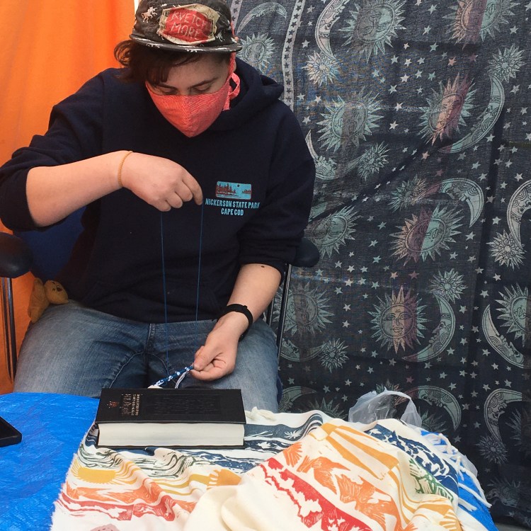 Each atarah [neckband. Hebrew, literally “crown”] and set of corner squares is lovingly hand dyed with botanical materials gathered locally on Nipmuc land. These carefully prepared sections of silk may be dyed with nettle, aster, goldenrod, mulberry, wild grape, or chestnut, among a variety of other dyestuff.