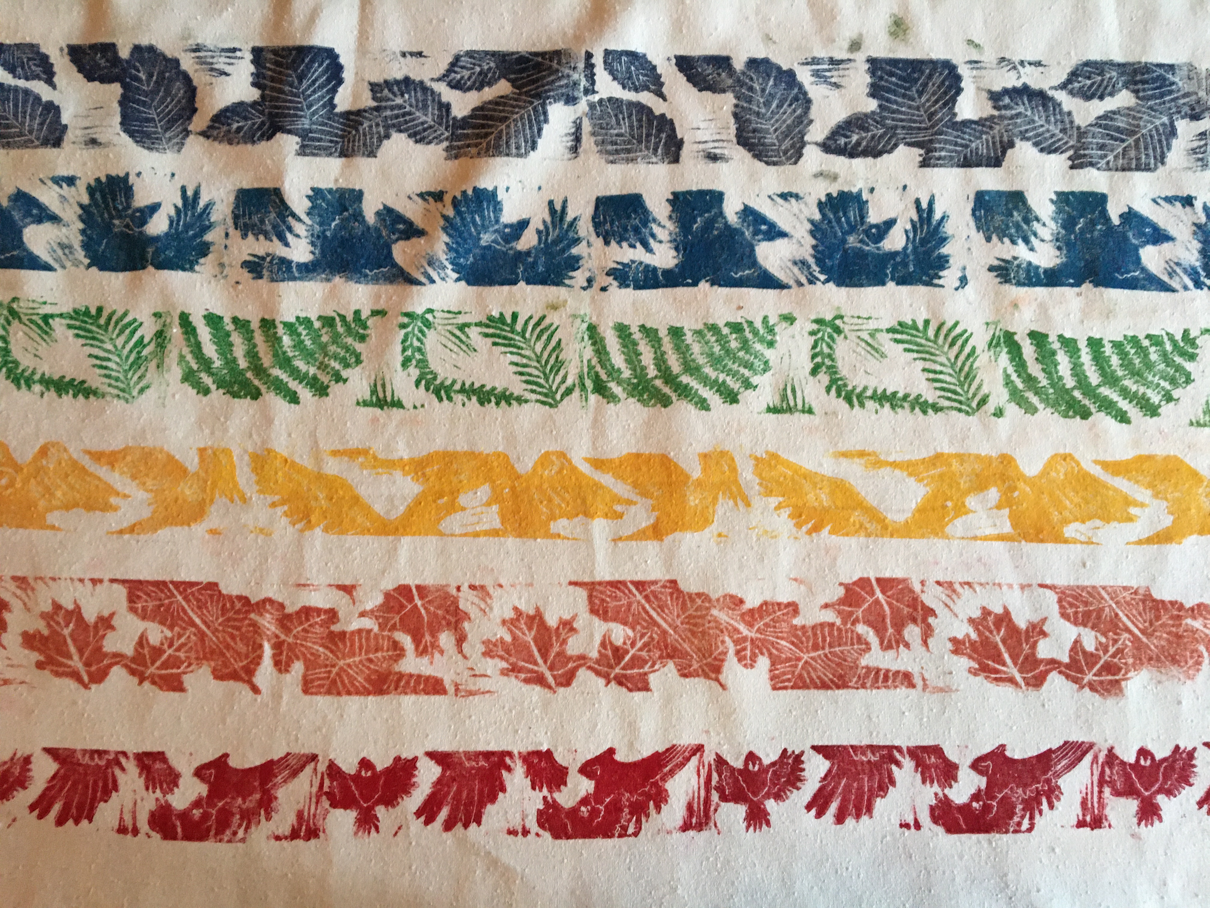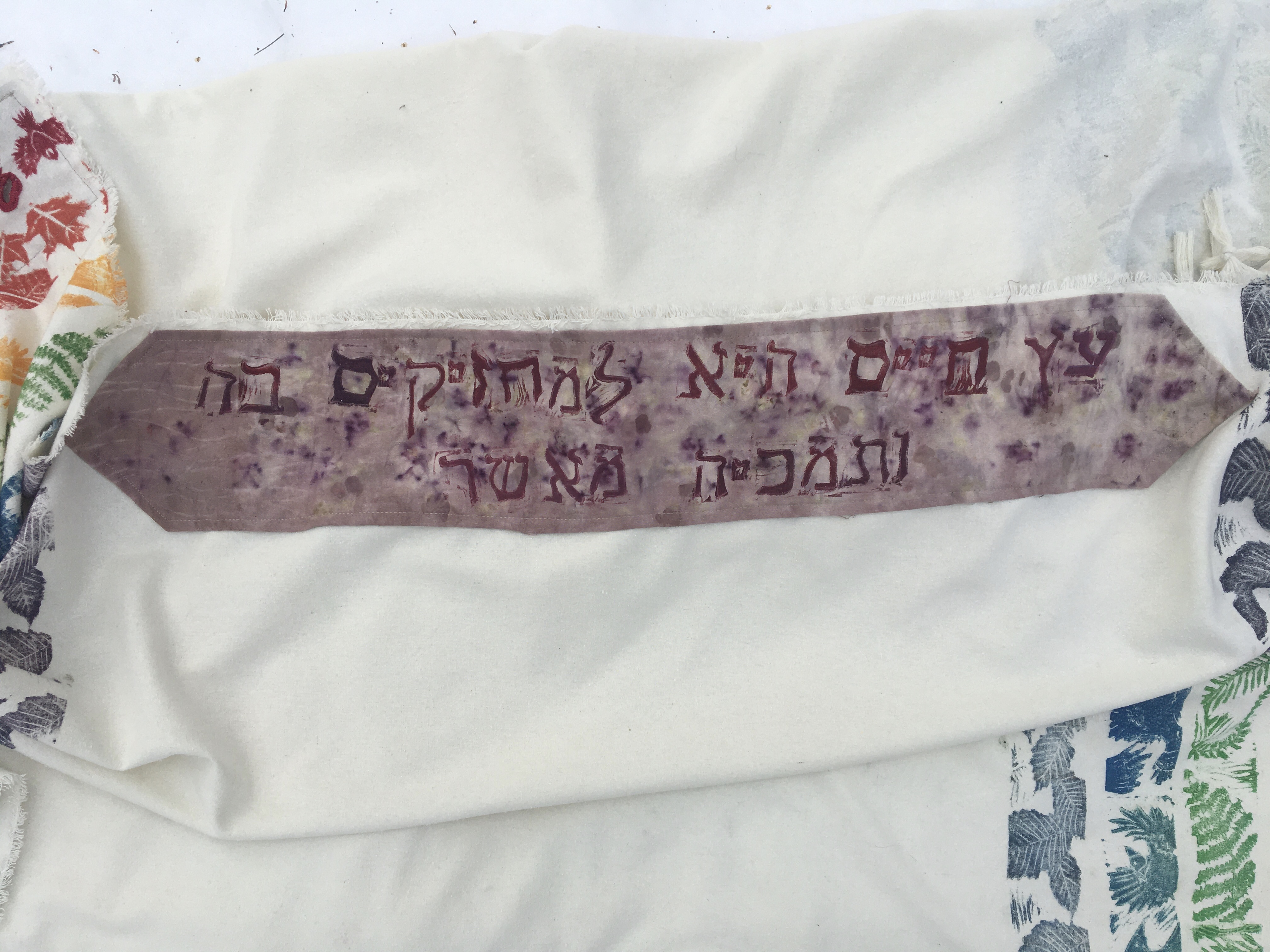 Created for a client whose Hebrew name means bird, this tallis is a colorful meditation on a forest filled with birdsong. The corner squares and atarah are hand dyed with mulberries gathered locally on Nipmuc land, and ecoprinted with aster, wild grape, and black beans.