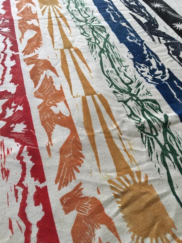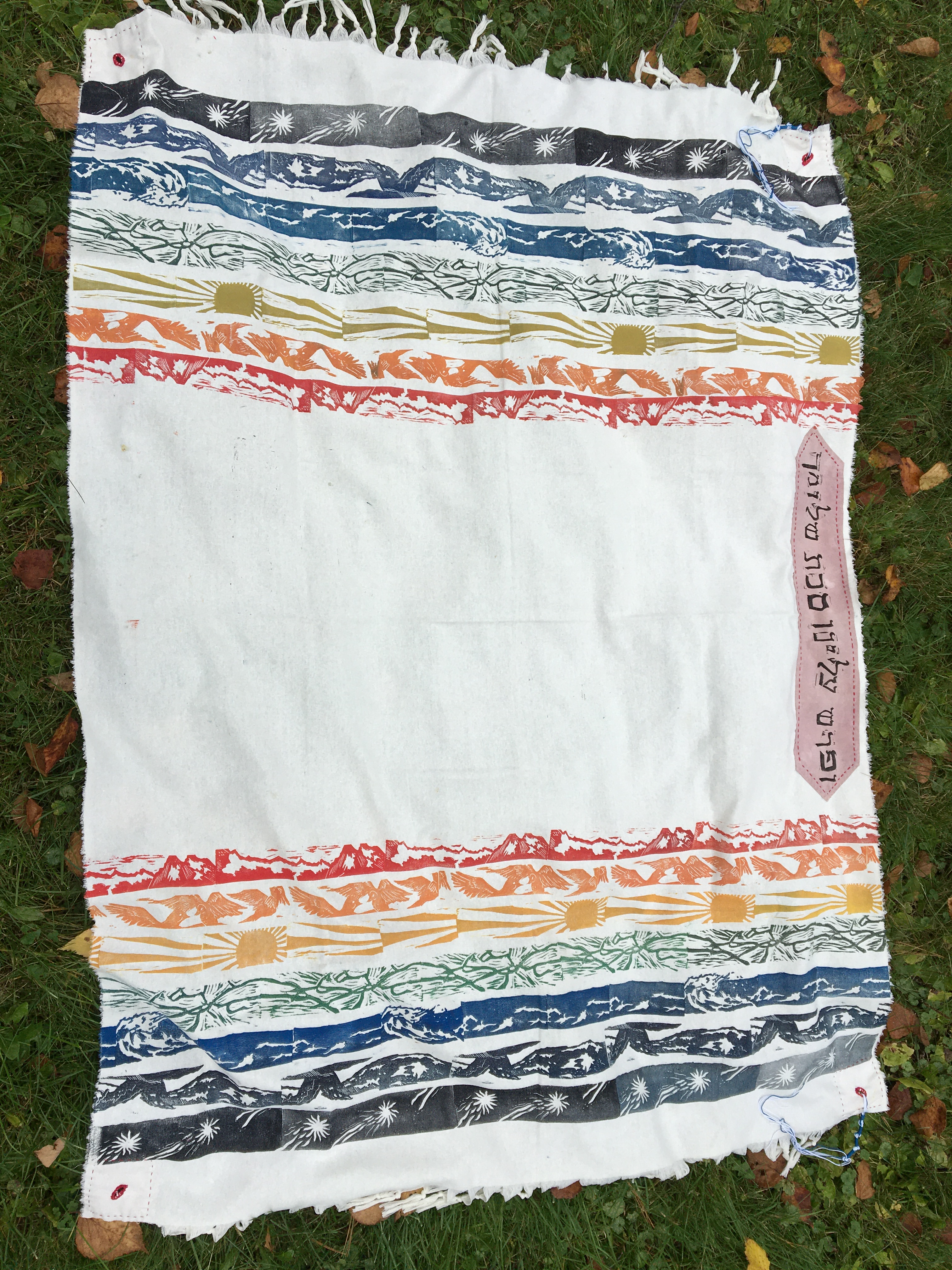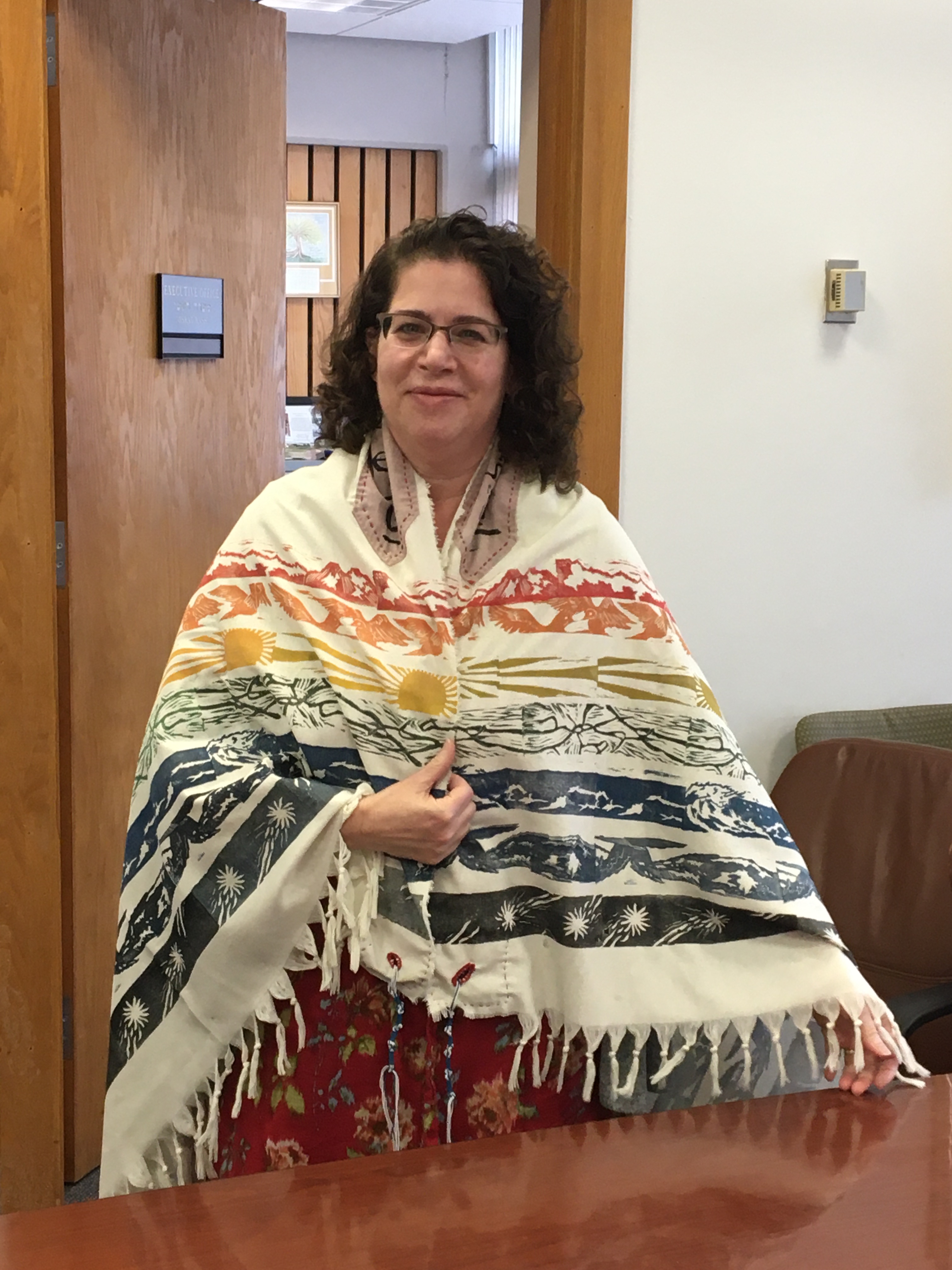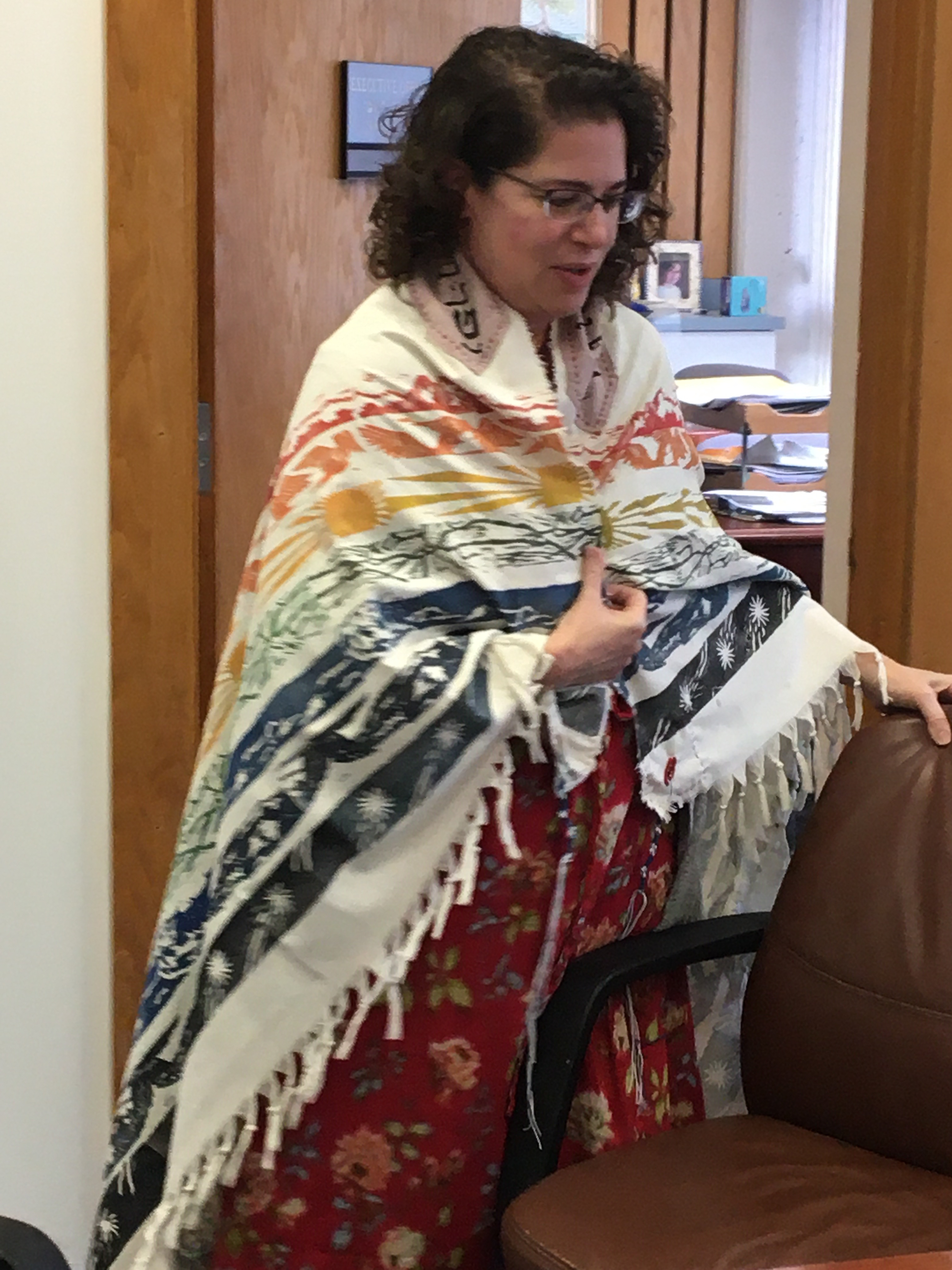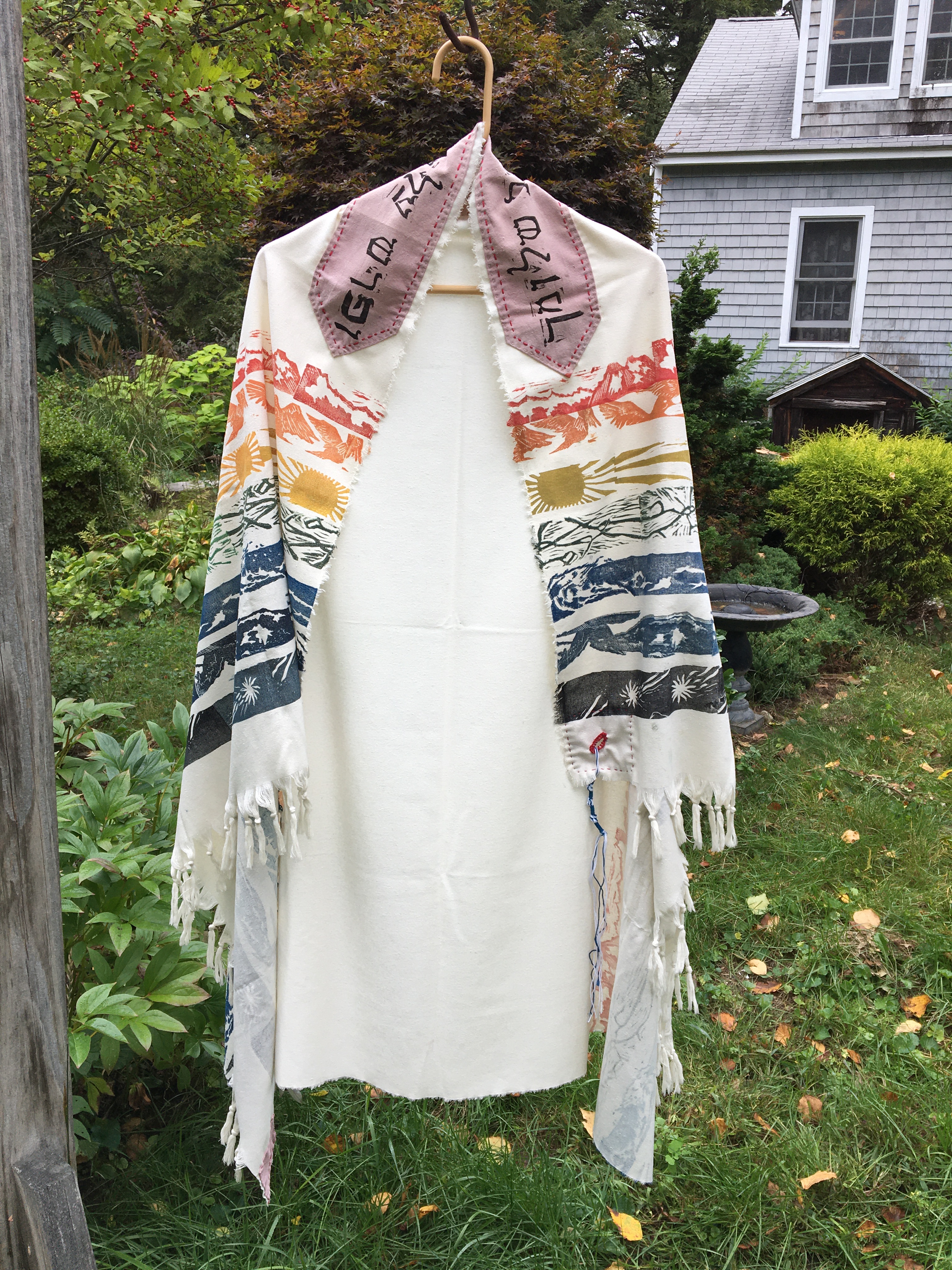 Mulberries gathered locally in Nipmuc land were used in dyeing the atarah and corner squares. The atarah bears the pasuk “Ufros aleinu sukkat shlomecha” from the Hashkiveinu prayer, asking the Divine to “Spread over us your shelter of peace”.