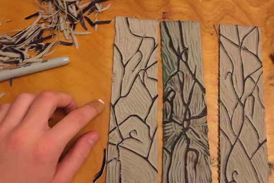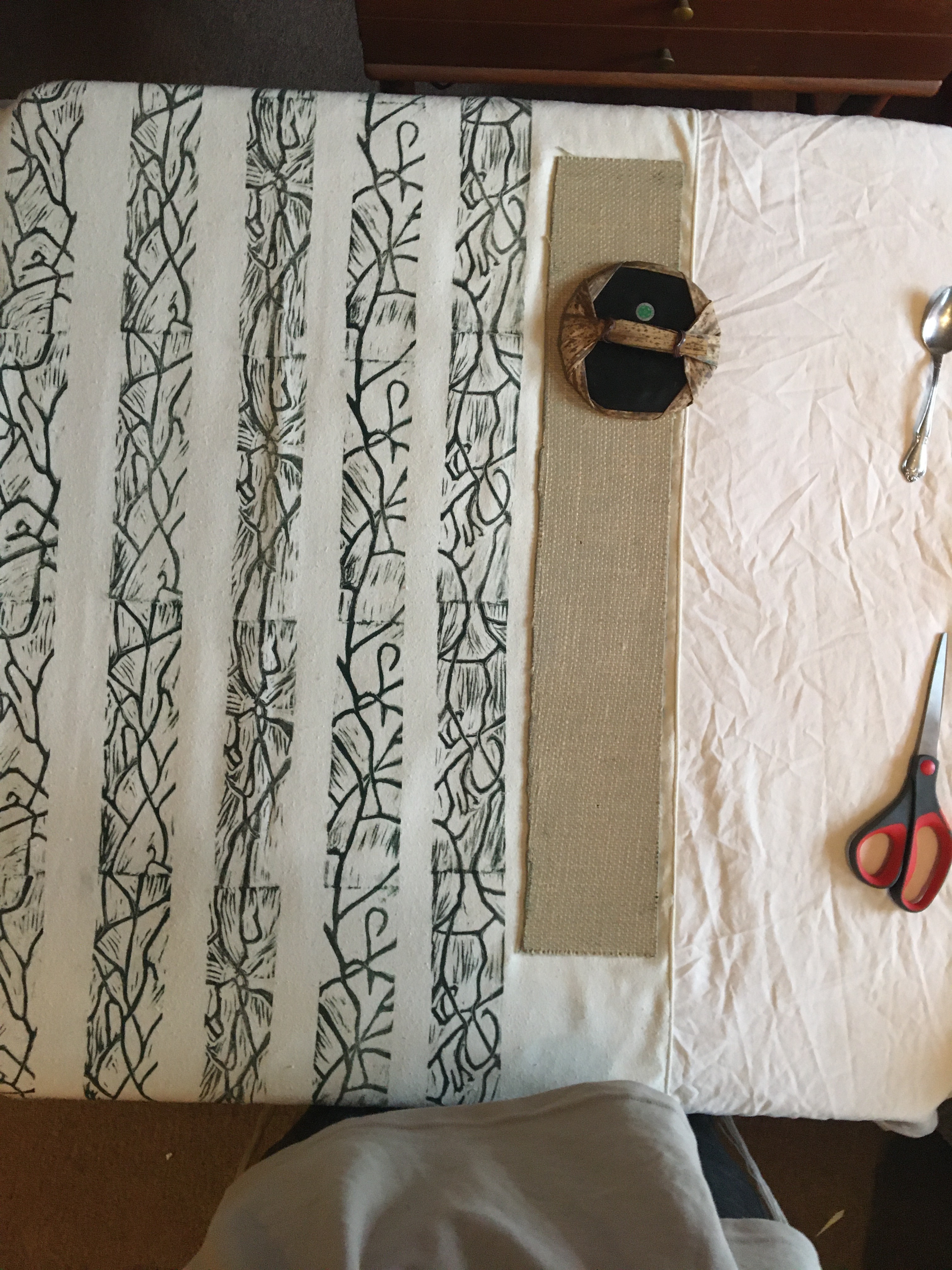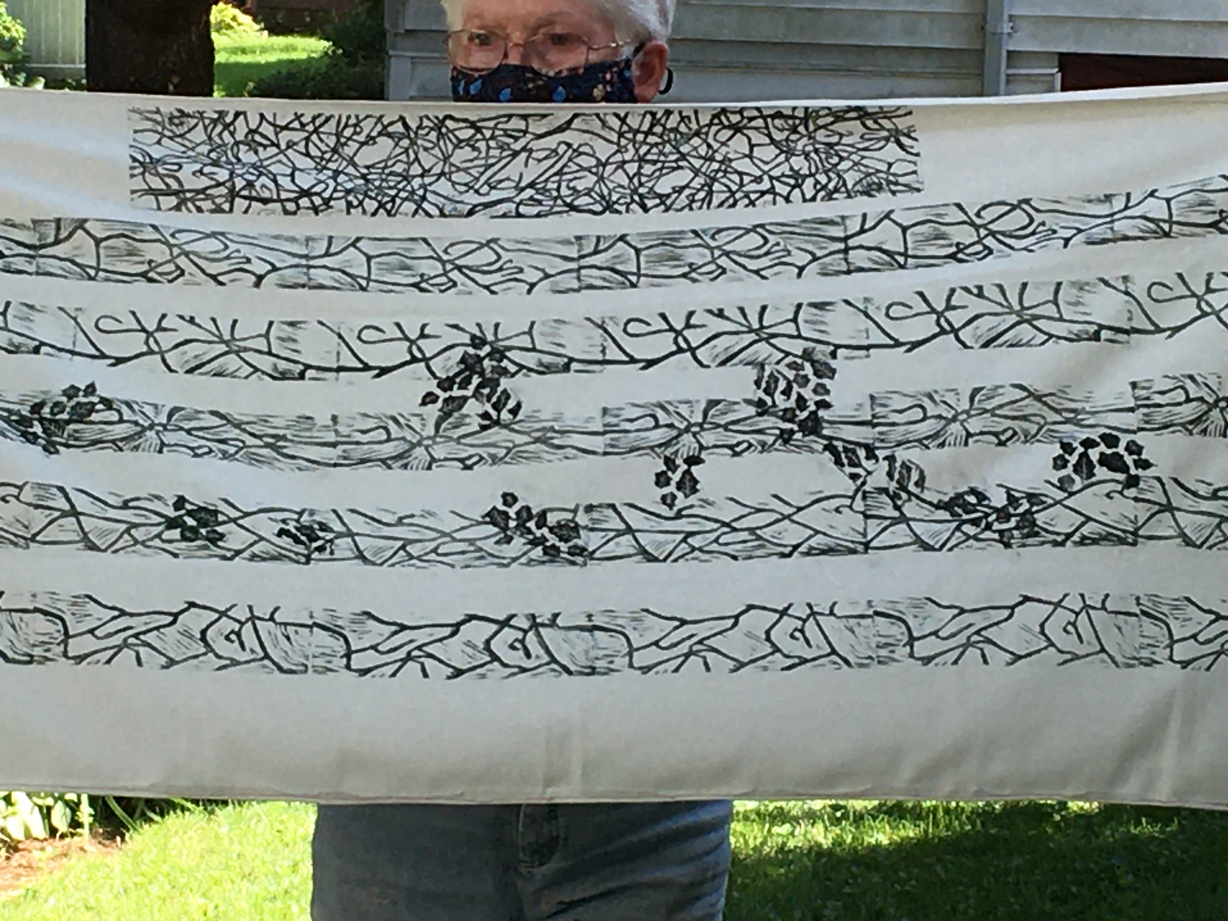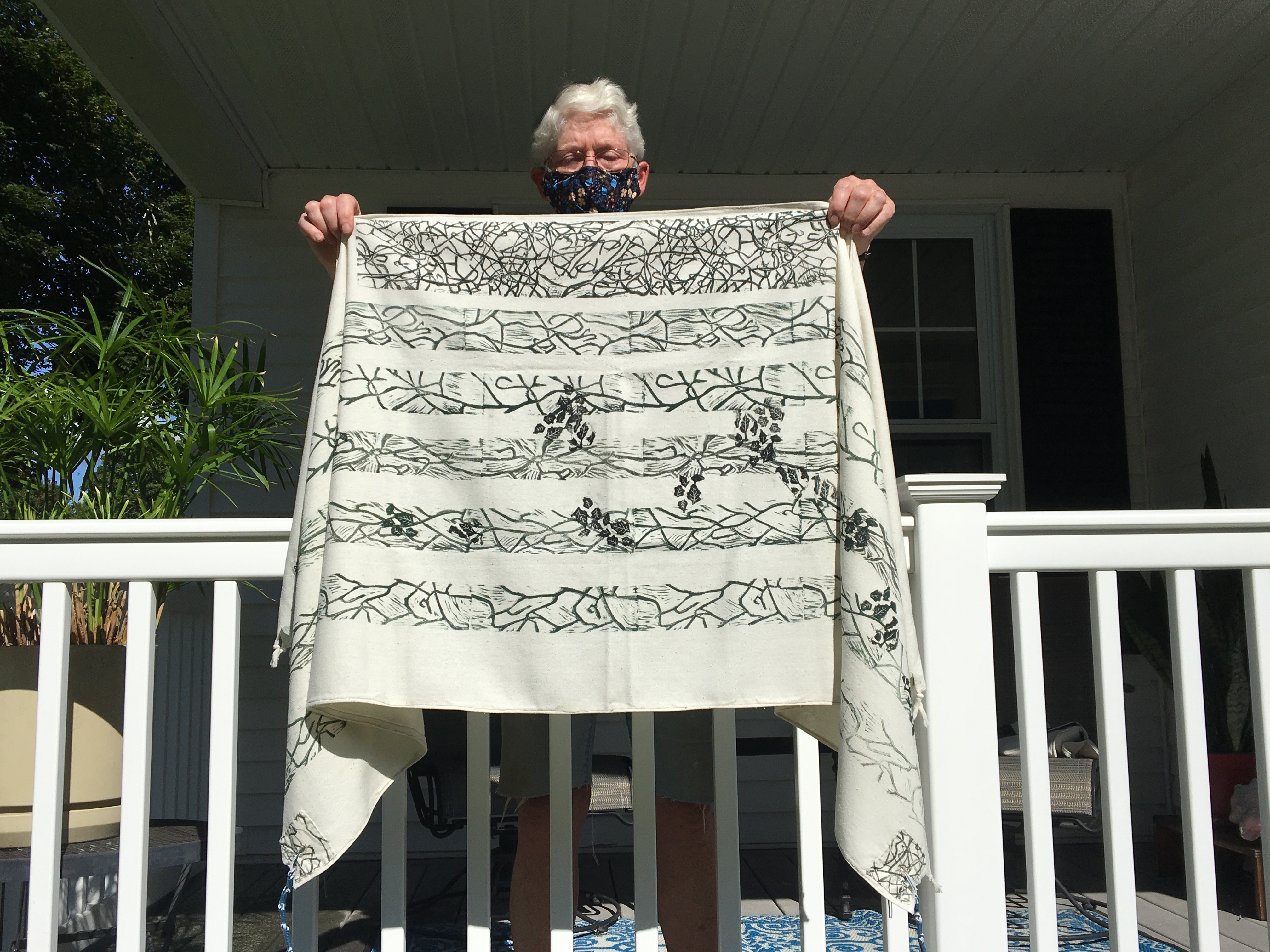 Five lines of curling vines form a musical staff on which mikania ternata leaves congregate as music notes to form the nusach [liturgical melody] for the Shabbat morning Shema.