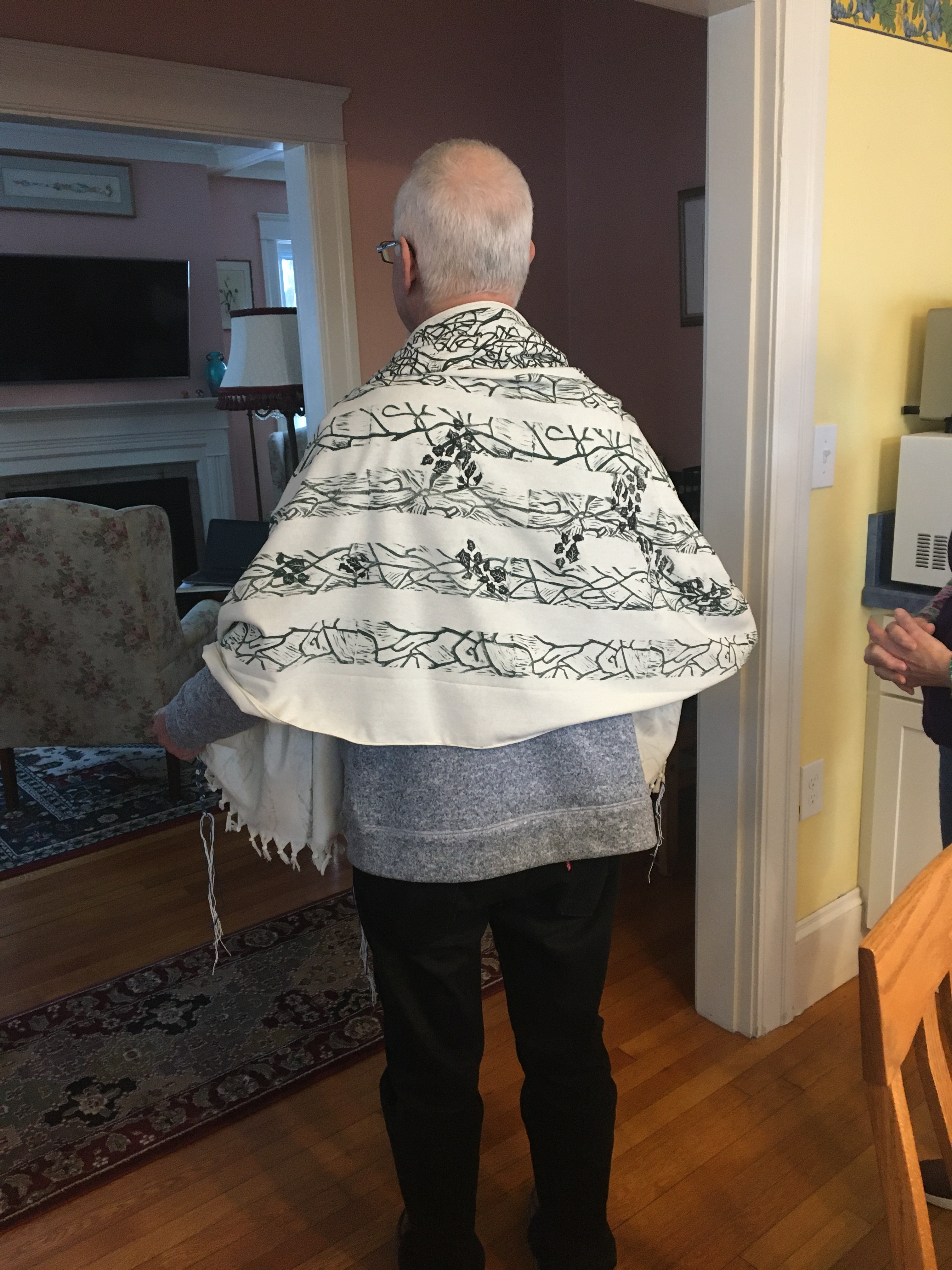 The Shema is considered to be the central declaration of faith in Judaism. The six simple words are put to many different tunes for different occasions. This tallis was designed for a loved one who wears many hats, among which are barbershop quartet singer and shaliach tzibbur [congregational prayer leader].